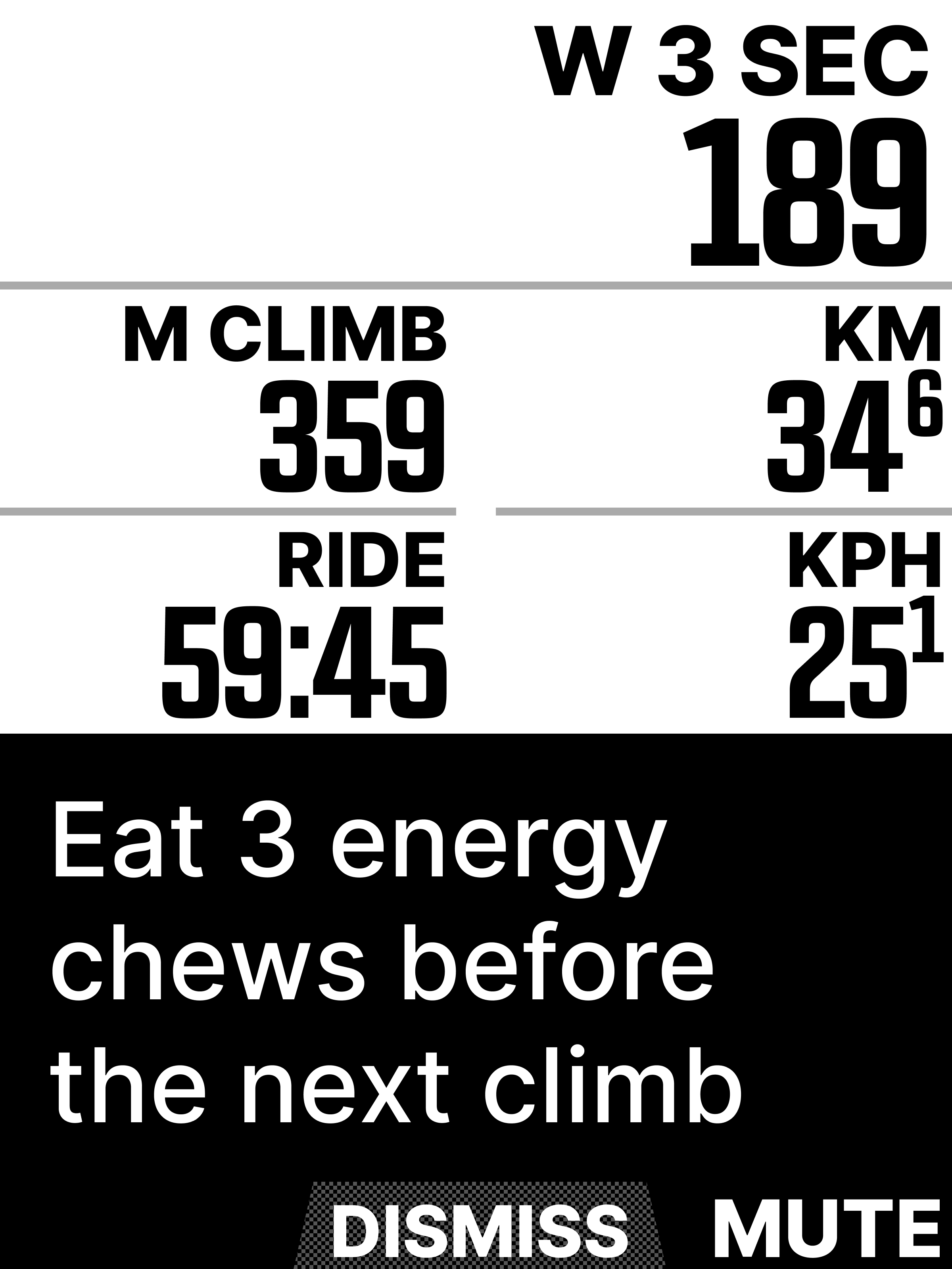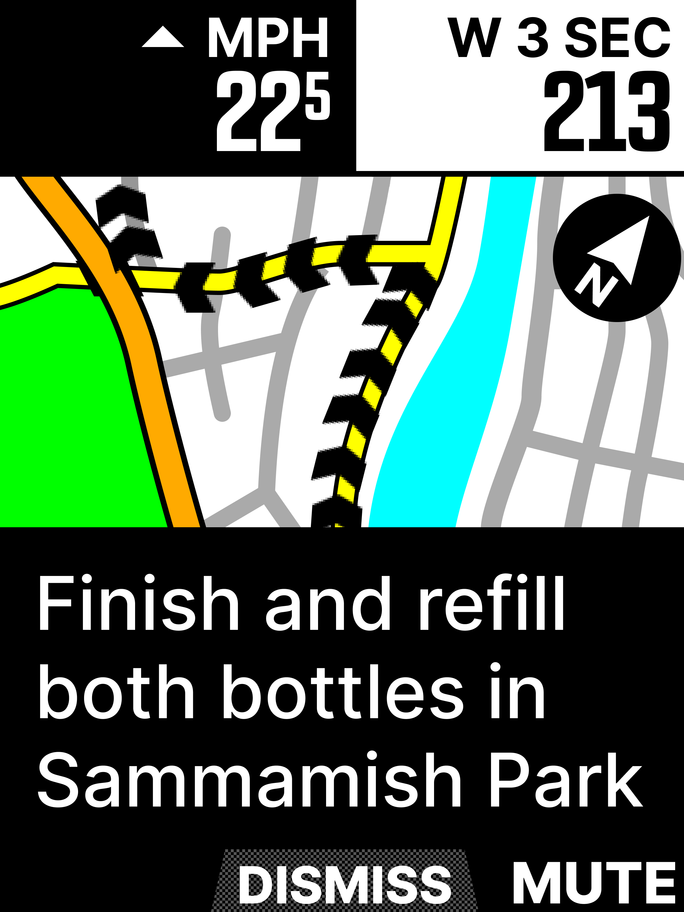 When racing, a user that receives an alert is often not able to acknowledge it until they’re in a safe setting to do so. For example, a Mountain Bike racer descending downhill. They will be able to execute on the alert (i.e. eat snack) once they’re on safer terrain. Because of this, I decided to keep alerts present UNTIL dismissed manually.