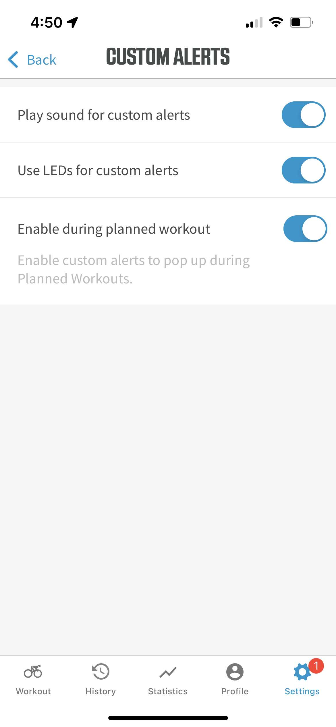 When a user has alerts toggled to ON they will see "X alerts selected" on their main workout tab