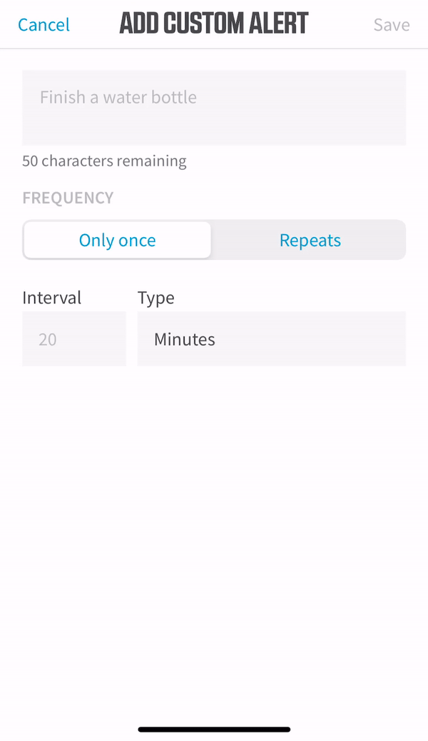 After reviewing use cases, I decided the best way to move forward with custom alerts for its initial launch was to include (1) a single-fire alert (happens once and only once ), and a repeatable interval alert (like eating every 1 hour).